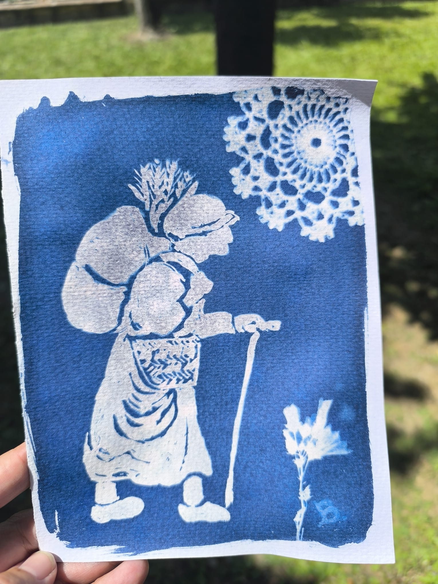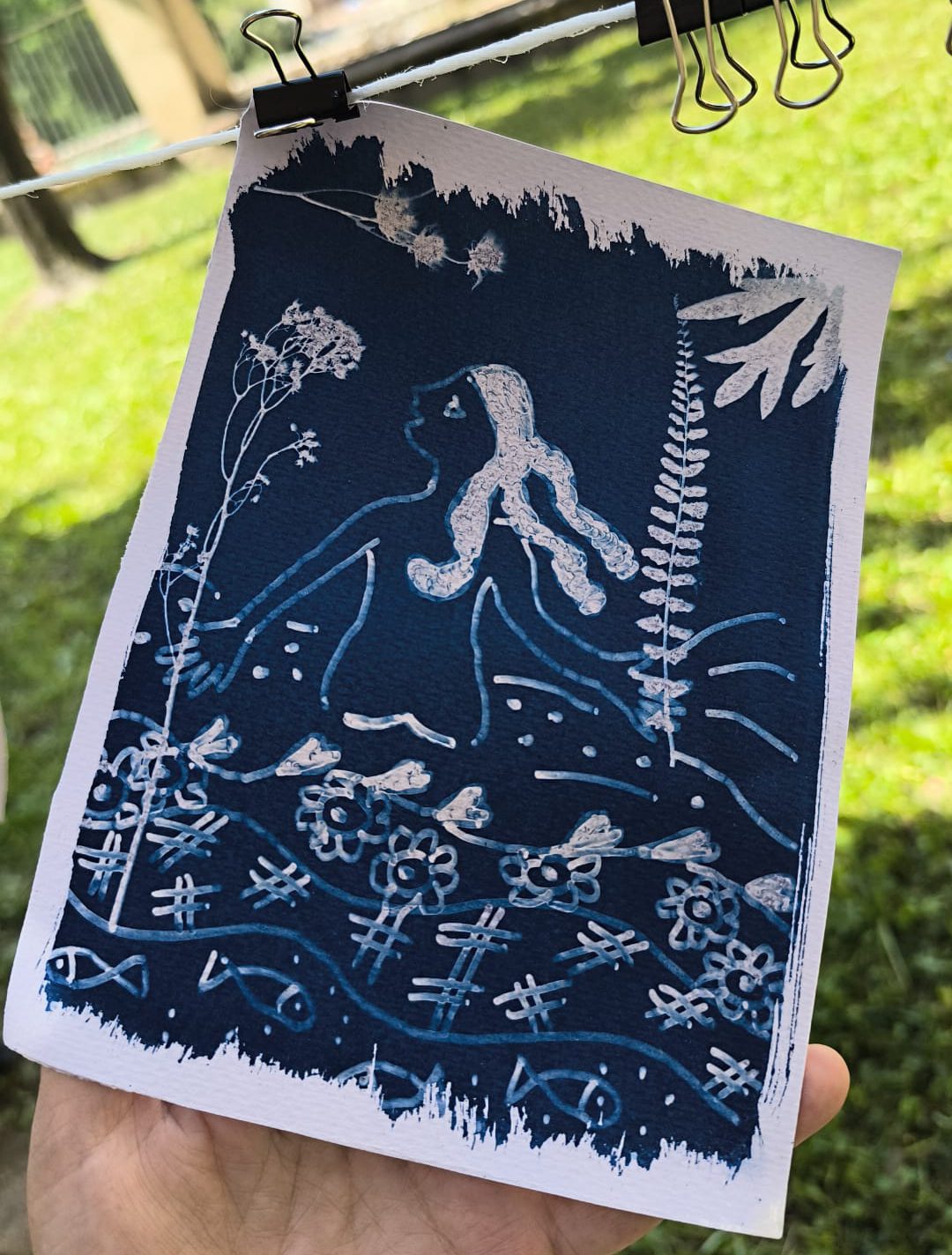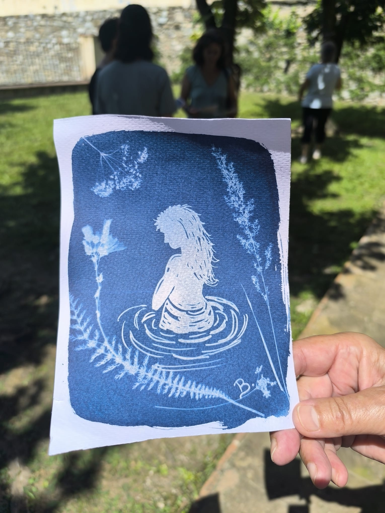 Tot seguit, i després de la inspiració del joc, des del col·lectiu Desperta, art i natura de Sant Joan vam acompanyar les participants en la creació de cianotípies. Les imatges, dibuixos i plantes escollides es van transformar en composicions úniques, plenes de blau i de vida, que donaven una nova dimensió a les històries treballades. A través de l’art i la natura, vam poder connectar amb la memòria de les dones i alhora obrir un espai creatiu i de calma compartida.