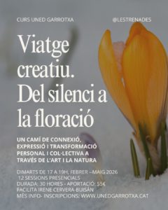 Igual que la natura té els seus cicles, nosaltres també necessitem espais per aturar-nos, arrelar i després florir. Aquest no és un curs qualsevol, sinó un viatge, una aventura creativa on la natura i l’art ens guiaran per transformar-nos, plegades. Al llarg de 12 sessions treballarem amb l’art i la natura. Farem activitats molt senzilles: observació, collage, escriptura, estampació, observació… No cal tenir cap experiència artística. L’important no és el resultat, sinó el procés: aturar-nos, escoltar-nos, reconnectar amb nosaltres i amb el grup.